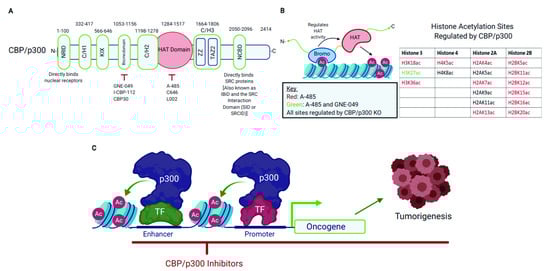 Structure and Function of acetyltransferases CBP/p300. (A) Structural modules of CBP/p300. Amino acid numbers are based on the p300 protein sequence. (B) Sites of histone acetylation catalyzed by CBP/p300 on the four core histones. All sites are regulated by CBP/p300; sites in red are downregulated by A-485 and sites in green are downregulated by both A-485 and GNE-049. (C) CBP/p300 function as co-activators of specific transcription factor. CBP/p300 inhibitors can reduce oncogene expression. Abbreviations: ac: acetylated lysine; Bromo: bromodomain; C/H1, C/H2 and C/H3: cysteine–histidine-rich regions 1, 2 and 3; NRID: the nuclear receptor interaction; HAT: histone acetyltransferase; IBiD: interferon-binding domain; KIX: a kinase-inducible CREB interaction region; NCBD: the nuclear co-activator-binding domain; SID/SRCID: steroid receptor co-activator protein-interaction domain; SRC: steroid receptor co-activator protein; TAZ: transcriptional adaptor zinc-binding domain; TF: transcription factor; ZZ: ZZ-type zinc finger.