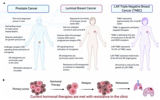 Challenges in Hormone-Dependent Prostate and Breast Cancers. (A) An overview of the clinical challenges for hormone-dependent prostate cancer, luminal breast cancer, and LAR (luminal androgen receptor) triple-negative breast cancer. (B) Resistance to hormonal therapies is a critical clinical challenge after patients relapse on therapy, as depicted in the diagram.