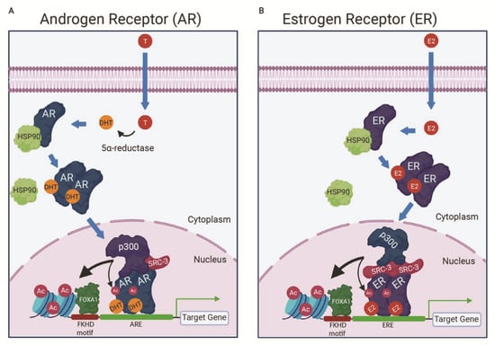 Nuclear Hormone Receptor Signaling. (A) An overview of the androgen receptor signaling cascade and formation of the AR activation complex at the ARE in AR target genes. (B) An overview of the estrogen receptor signaling cascade and formation of the ER activation complex at the ERE in ER target genes. Ac: lysine acetylation; ARE: androgen response element; DHT: 5α-dihydrotestosterone; E2: 17β-Estradiol; ERE: estrogen response element; FKHD: forkhead motif; HSP: heat shock protein; T: testosterone.