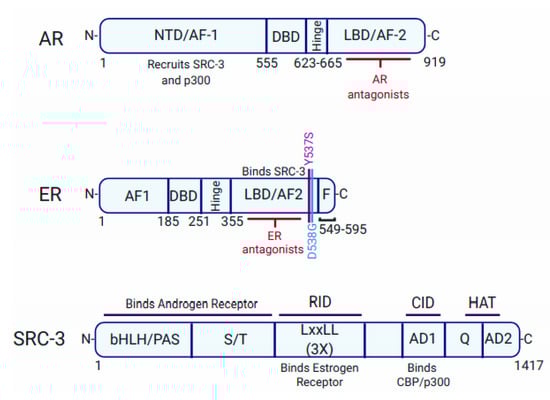 As a DNA-binding transcription factor, the AR has nearly 200 known co-regulators that can activate or repress AR target genes [124]. Targeting the co-regulators of the AR with small molecule inhibitors is an emerging strategy for ablating AR activity [28,52]. CBP/p300 are key co-activators for AR-mediated transcription and represent promising therapeutic targets to inhibit AR activity in PCa [50,155,156,157,158]. Early studies suggested that the AR recruits CBP/p300 to its target genes through an indirect interaction mediated by the Steroid Receptor Co-activator proteins (SRC-1, SRC-2, and SRC-3) [155,159,160]. Mechanistically it was thought that the LBD of the AR interacts with the SRC proteins, which then recruit CBP/p300 to the AR activation complex [155,159,160]. The SRC proteins interact with the LBD of nuclear receptors, including the AR, via an LXXLL motif found in the SRC receptor interaction domain (RID) (Figure 4) [159,160,161]. SRC-1 also interacts with a region known as the AF-1 in the NTD of the AR, which appears functionally more important than the SRC-1/AR-LBD interaction for AR-mediated transcriptional activation (Figure 4) [159].