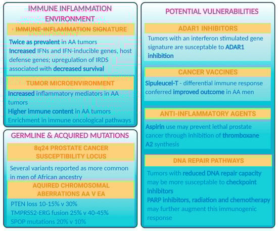 The immune–inflammation signature that was initially described by Wallace et al. to be prevalent in prostate tumors of African American patients is central to the hypothesis that inflammation is a candidate driver of prostate cancer disparities [53]. Subsequently observed by others [54] and validated in TCGA [55], this signature includes upregulation of genes in the interferon (IFN) signaling pathway and contains elements of a viral mimicry signature. Further investigations of this signature in prostate tumors from African American men describe a signature which corresponds to a previously described “interferon-related DNA damage resistance signature”, also termed IRDS [56,57]. Detection of IRDS is a marker of decreased disease-free survival in prostate cancer and has been linked to acquired resistance to radiation and chemotherapy in breast cancer. Thus, upregulation of this signature in African American tumors indicates a mechanism by which either inflammatory ancestral factors or a yet unknown infectious agent may contribute adversely to prostate cancer outcomes. Even though the presence of IRDS in a tumor may indicate an adverse outcome, this signature may also constitute a vulnerability. Tumors with an interferon-stimulated gene signature were reported to be highly susceptible to inhibition of adenosine deaminase acting on RNA (ADAR1) [58,59].