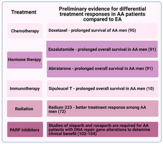 It is assumed by many that the prostate cancer biology in men of African ancestry is intrinsically more aggressive—at least for a subset of patients—leading to a survival health disparity in the population [104]. Yet, this does not mean that African American men would not respond as well as European American men to most standard therapies. In fact, it appears that the treatment responses of African American and European American men are mostly similar. Yet, tumors in African American men could still respond better to certain therapies compared to the average response among European American men. Some of the treatments or combination treatments discussed in this review were the subject of small clinical trials and so these therapeutic options might not be widely offered yet in the clinic. Therefore, the findings require further evaluation in larger studies but do suggest that there is a potential role for these treatments in reducing the survival disparities observed in prostate cancer. African American men are less likely to be recruited into clinical trials and may not have the opportunities to avail of these new therapeutic options.