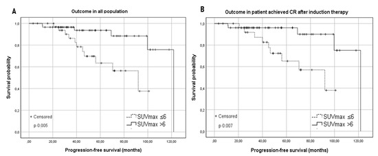 (A) Kaplan–Meier survival curves for the progression-free survival (PFS) in the studied population according to the baseline SUVmax with a cut-off of 6. (B) Kaplan–Meier survival curves for the progression-free survival (PFS) according to the baseline SUVmax in patients who achieved a complete response (CR) after induction therapy.