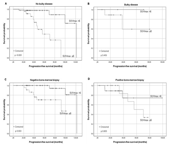 Kaplan–Meier survival curves for the progression-free survival (PFS) according to the baseline SUVmax in relationship to risk factors: (A) FL without Bulky disease, (B) FL with Bulky disease, (C) FL without Bone Marrow involvement, and (D) FL with Bone Marrow involvement. Similar results were found in the presence and absence of other risk factors reported in Table 2.