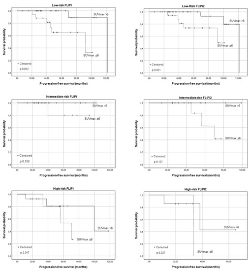 The progression-free survival (PFS) according to the baseline SUVmax in relationship to the Follicular Lymphoma International Prognostic Index (FLIPI) and Follicular Lymphoma International Prognostic Index 2 (FLIPI2) risk categories. From top to bottom: low-risk patients, intermediate-risk patients, and high-risk patients.