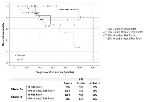 High metabolic activity at the onset, in the absence of other aggressive disease characteristics, was significantly correlated with a higher chance of long-term remission after treatment. Figure 4 shows that patients with SUVmax > 6 and carrying at least two risk factors had a comparable outcome to patients with SUVmax ≤ 6. Unexpectedly, patients who showed no risk factors at diagnosis and a baseline SUVmax ≤ 6 had a greater tendency to long-term relapse showing a worse outcome compared with patients who presented at least two aggressive disease characteristics and a high FDG uptake.