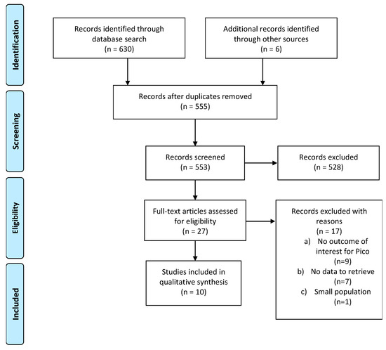 The initial search produced 634 potentially relevant articles. After removing duplicates, 553 abstracts were assessed for eligibility, and 25 full texts were considered for subsequent assessment. Eight studies were included in the final analysis after full-text evaluation. Details of the whole screening process, including the reasons for full-text exclusion, are reported in Figure 1 (PRISMA flow-chart).