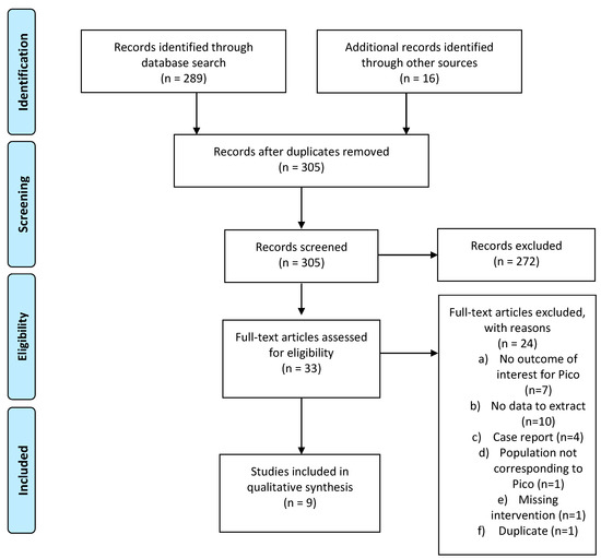 Thirty-three relevant publications were retrieved as full text out of 305 publications screened. Of these, 21 were excluded and 9 studies were included in the final sample of analysis: 3 studies regarding PICO 2a, and 6 studies regarding PICO 2b. Details of the whole screening process, including the reasons for full-text exclusion, are reported in Figure 2 (PRISMA flow-chart PICO 2), and the details of eligibility and data extraction are reported in Table S3.