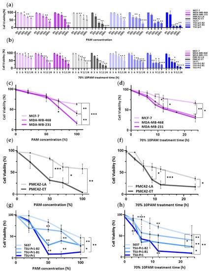 A concentration of 70% 10PAM was then chosen for the time gradient experiment (Figure 1b,d), as the cytotoxic effect of 70% 10PAM had been observed in all the cell lines. The results showed that mesenchymal cell lines responded to 70% PAM at earlier time points than the epithelial counterparts in each system. Taking breast cancer cell lines as an example. MCF-7 cells took 9 h to respond to 70% 10PAM, while MDA-MB-231 cells took 6 h. From the results of Figure 1c,d, we could gain the same conclusion. The ET/LA (Figure 1e,f) and bladder cancer cell lines (Figure 1g,h) showed the same patterns.