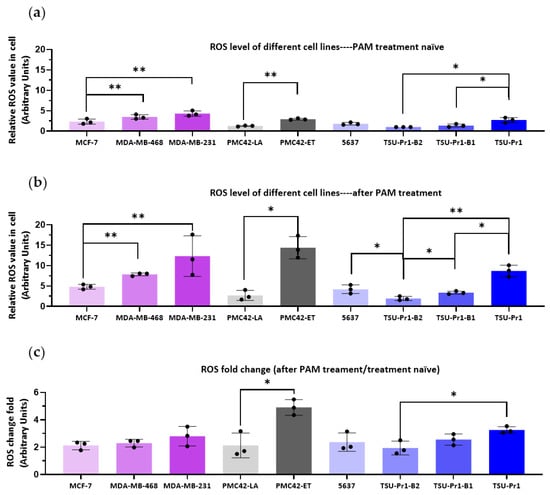 The ROS levels after 70% 10PAM 12 h treatment increased in all cell lines (Figure 2b), however those in mesenchymal cell lines showed a higher increase than the epithelial cell lines. The fold changes of ROS levels were significantly (p = 0.016) lower in PMC42-LA (2.1 ± 0.9) than PMC42-ET (4.9 ± 0.6), and lower in TSU-Pr1-B2 (1.9 ± 0.4) than its’ parental TSU-Pr1 (3.3 ± 0.2) cells (p = 0.028) (Figure 2b).