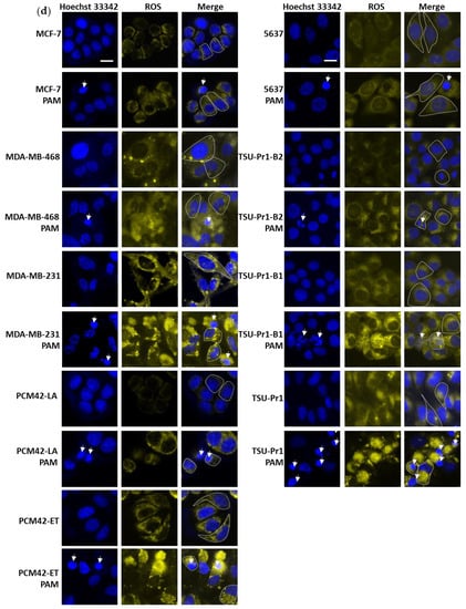 The cell morphologies of epithelial cell lines MCF-7, PMC42-LA, TSU-Pr1-B2, and TSU-Pr1-B1 were cuboidal and closely adherent to each other (Figure 2d), and we observed that these cells had relatively low levels of ROS staining in the absence of PAM treatment (Figure 2a). In contrast, the mesenchymal counterparts (MDA-MB-231, PMC42-ET, 5637, and TSU-Pr1) exhibited a spindle-like and spread-out morphology, as well as appreciably higher ROS levels. After PAM treatment, a proportion of the cells underwent cell death (indicated by the white arrows in Figure 2d). The nuclei of the cells exhibiting PAM-induced apoptosis appeared shrunken or were dispersed into apoptotic bodies. The ROS levels seen in these cells in the mesenchymal cell lines/variants were dramatically higher than those in the epithelial cell lines. Interestingly, almost no ROS were detected in PMC42-LA cells.