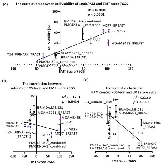 Transcriptomally derived EMT scores correlate with PAM response. (a) Correlation between cell viability following 12 h 100% 10PAM treatment and EMT score 76GS for MCF-7, MDA-MB-468, MDA-MB-231, PMC42-LA, PMC42-ET, 5637, and TSU-Pr1 (T24). In some cases, scores were derived using data for the same cell line from different public repositories (e.g., CCLE: BR.MCF7, BR.MDA.MB.231; NCI60: MCF7_BREAST, MDAMB231_BREAST). (b) Correlation between untreated (baseline) cellular ROS levels and EMT score 76GS. (c) Correlation between PAM-treated cellular ROS levels and EMT score 76GS.