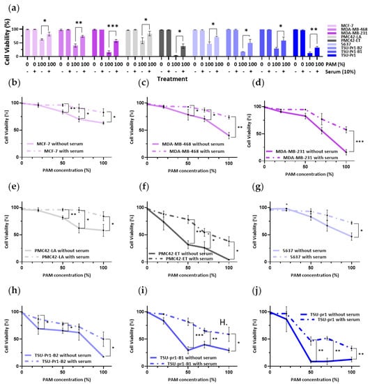 Impact of serum on PAM effect on cell viability. (a) Breast cancer cell lines (MDA-MB-231/MDA-MB-468/MCF-7; pink) and EMT/MET cell line systems in breast (PMC42-ET/LA; grey) and bladder (5673/TSU-Pr1/B1/B2; blue) cancer cells were plated in growth media for 24 h prior to 3 h serum starvation. Cells were then treated with 0% or 100% 10PAM in the absence or presence of FBS (10%) for another 12 h. After the treatment, these cells were stained with DAPI for DNA and PI for apoptosis assessment, and the cell viability was calculated by live/dead cell assay. MCF-7 (b), MDA-MB-468 (c), MDA-MB-231 (d), PMC42-LA (e), PMC42-ET (f), 5637 (g), TSU-Pr1-B2 (h), TSU-Pr1-B1 (i), and TSU-Pr1 (j) cells were plated as per (a) and treated with 0%, 25%, 50%, 75%, and 100% 10PAM for 12 h in the absence or presence of FBS (10%). The cell viability was tested as per (a); dotted lines represent plus serum. The mean and SEM of the average for each data point from each of the 3 experiments are shown. “*” represents a p < 0.05, “**” represents a p < 0.01, and “***” represents a p < 0.001.