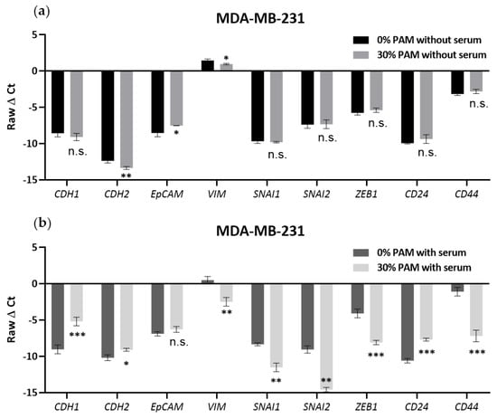 Changes in EMT markers after PAM treatment without or with serum. MDA-MB-231 cells were plated in a 48-well plate overnight and treated with 0% or 30% 10PAM without (a) or with 10% serum (b) for 3 days. Epithelial (CDH1), mesenchymal (CDH2, EpCAM, VIM, SNAI1, SNAI2, ZEB1), and stemness (CD24, CD44) markers were detected via real-time RT-qPCR. The mean and SEM of the average for each data point from each of the 3 experiments are shown. “*” represents a p < 0.05, “**” represents a p < 0.01, “***” represents a p < 0.001, and “ns” represents not significant.