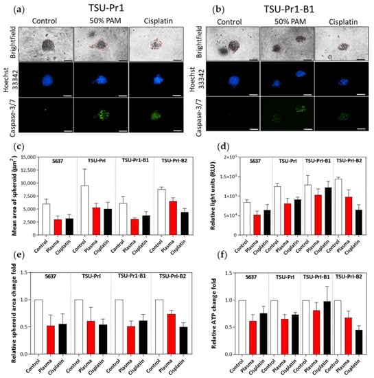 The 3D bladder cancer cells’ responses to PAM treatment. Representative images of spheroids from bladder cancer cell lines TSU-Pr1 (a) and TSU-Pr1-B1 (b). Treatment was performed for 6 days with control, 50% PAM, and 10 mM cisplatin. DNA was assessed with Hoechst 33342 (blue) and caspase-3/7 (green) staining using CellEvent Caspase-3/7 dye. Scale = 100 µm. (c) Area of spheroids from cell lines; control, treated with 50% PAM, or treated with 10 mM cisplatin (to mimic treatment of MIBC). SD calculated from the area of 5–10 spheroids. Only spheroids with ~>50 cells were counted. (d) Overall ATP production of treated bladder cancer cell line organoids was used as a measure of cellular viability, measured as RLU using the CellTiter-Glo 3D Cell Viability Assay following treatment. Average of 3 technical replicates normalized to background luminescence. (e) The relative fold change in spheroid area, representing the normalized data of (c). (f) The relative fold change in ATP levels, representing the normalized data of (d). These results are from a single pilot experiment with 10 spheroids for each treatment group.