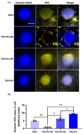 ROS level of PAM-treated 3D bladder cancer cell spheroids. (a) Representative images of ROS staining. After 6 days of 50% 10PAM treatment, the four cell line spheroids were stained for ROS and images were taken. DNA was assessed with Hoechst 33342 in blue and ROS staining with CellROX in yellow. The use of both of these stains in conjunction with the confocal capability of the InCell 6500HS instrumentation shows that the ROS staining is at the edge/surface, either surrounding the cell mass reflected by DNA staining (as in TSU-Pr1-B2) or above or below as in the other cell lines depicted. Scale = 100 µm. (b) The quantification of ROS level. Average of 3 technical replicates normalized to TSU-Pr1-B2 ROS luminescence. N = 1. These results are from a single pilot experiment with 10 spheroids for each treatment group. “*” represents a p < 0.05 and “**” represents a p < 0.01.