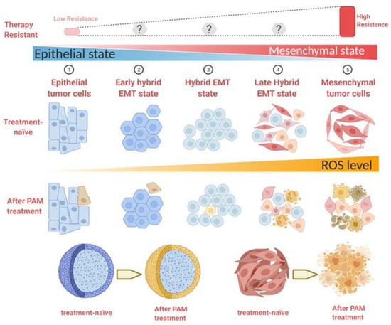 Schematic illustration of the relationship between EMT status, resistance to conventional therapies, responses to PAM, and ROS levels. Created with BioRender.com (accessed on 14 April 2021).