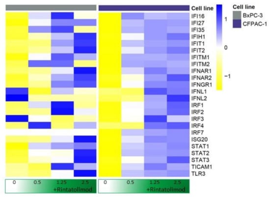Upregulated antiviral proteins in BxPC-3 cells that were treated with Rintatolimod.