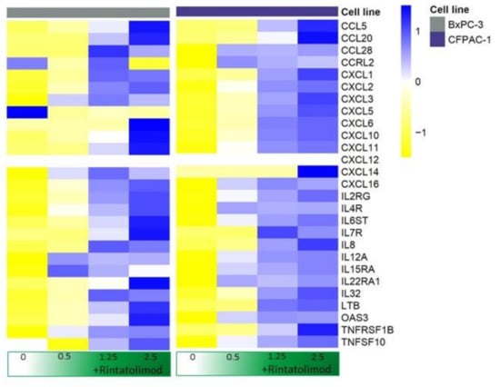 Rintatolimod produced immunomodulatory activity in HPAC cells. Heat maps of cytokines and interleukins that were differentially regulated as an effect of Rintatolimod. The expressions were gene-wise scaled and are displayed as colors ranging from blue (high expression) to yellow (low expression) as shown in the key. Cells were treated with various concentrations of Rintatolimod displayed as the intensity of green color from dark green (high dose) to white (PBS control).