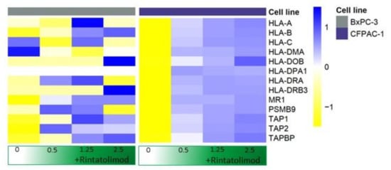 Rintatolimod induced the expression of MHC class I and II histocompatibility in HPDA cells. Heat maps of HLA-genes that were differentially regulated as an effect of Rintatolimod. The expressions were gene-wise scaled and are displayed as colors ranging from blue (high expression) to yellow (low expression) as shown in the key. Cells were treated with various concentrations of Rintatolimod displayed as the intensity of green color from dark green (high dose) to white (PBS control).