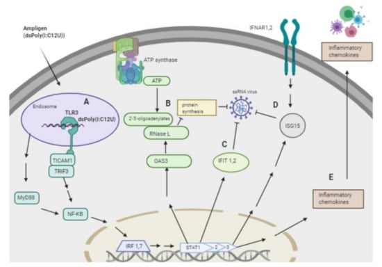 Schematic presentation of the overexpressed genes and the antiviral pathways activated by Rintatolimod. Rintatolimod (Ampligen; dsPoly (I: C12U)) enters the cells and targets the TLR3 in the endosome to start a cascade of actions. A—Stimulation of TLR3, which activates TICAM1 and TRIF3 that are involved in innate immunity against pathogens. Activation of TICAM1 and MyD88 mediate NF-kB expression that subsequently activates transcription factors such as IRF1 and IRF7. Interferon Regulatory Factors activate STAT1, 2, and 3 that stimulate the innate and acquired immune responses, mediate cellular responses to interleukin, and regulate inflammatory responses to infection. B—Activation of STAT1 and 2 upregulate the expression of OAS3, which induces the synthesis of 2′,5′-oligoadenylate (2–5 A) from ATP upon binding of dsRNA. 2–5 A activates RNase L, causing endonucleolytic cleavage of viral ssRNAs and blocking virus replication. C—TLR3 activation induces the expression of members of the IFIT family. The upregulation of IFIT1 and IFIT2 result in restriction of ssRNA virus replication in the cytosol. In addition, the IFIT family restricts virus replication through an alternation of protein synthesis and the ability of an antiviral protein to bind viral RNA directly. D—Activation of STAT 1, 2, and 3 activate the expression of interferon stimulatory genes (ISGs) like ISG15, which induces the antiviral state in the cytosol. ISG15 acts on ssRNA and directly degrades viral RNA. Treatment with Rintatolimod increased the expression of IFNAR1 and IFNAR2, which recognize interferon and activate JAK/STAT signaling pathways. E—Activation of STAT signaling pathways leads to the production of various cytokines, which results in the activation of the adaptive immune system. The pathway image was created with biorender.com.
