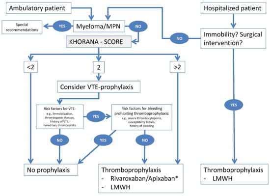 Kirschner, M.; do Ó Hartmann, N.; Parmentier, S.; Hart, C.; Henze, L.; Bisping, G.; Griesshammer, M.; Langer, F.; Pabinger-Fasching, I.; Matzdorff, A.; et al. Primary Thromboprophylaxis in Patients with Malignancies: Daily Practice Recommendations by the Hemostasis Working Party of the German Society of Hematology and Medical Oncology (DGHO), the Society of Thrombosis and Hemostasis Research (GTH), and the Austrian Society of Hematology and Oncology (ÖGHO). Cancers 2021, 13, 2905. https://doi.org/10.3390/cancers13122905