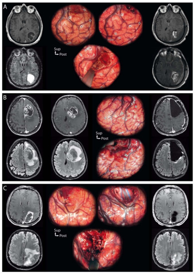 - Brown, T.J.; Brennan, M.C.; Li, M.; Church, E.W.; Brandmeir, N.J.; Rakszawski, K.L.; Patel, A.S.; Rizk, E.B.; Suki, D.; Sawaya, R.; et al. Association of the extent of resection with survival in glioblastoma: A systematic review and meta-analysis. JAMA Oncol. 2016, 2, 1460–1469. [Google Scholar] [CrossRef]
