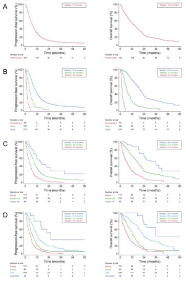 Kaplan–Meier estimates of progression-free and overall survival. (A) Kaplan–Meier estimates of progression-free survival (left) and overall survival (right) in the whole study population (434 patients). (B) Kaplan–Meier estimates of progression-free survival (left) and overall survival (right) according to the first-line oncological treatment received following surgery: standard radiochemotherapy (Stupp, blue line), other oncological treatment (Other, green line), and no treatment (No treatment, red line). (C) Kaplan–Meier estimates of progression-free survival (left) and overall survival (right) according to the type of surgery performed: biopsy (Biopsy, red line), surgical resection under asleep conditions (Asleep, green line), and surgical resection under awake conditions (awake, blue line). (D) Kaplan–Meier estimates of progression-free survival (left) and overall survival (right) according to the extent of surgical resection: biopsy (Biopsy, red line), partial surgical resection (Partial, green line), total surgical resection (total, light blue line), and supratotal surgical resection (supratotal, blue line).