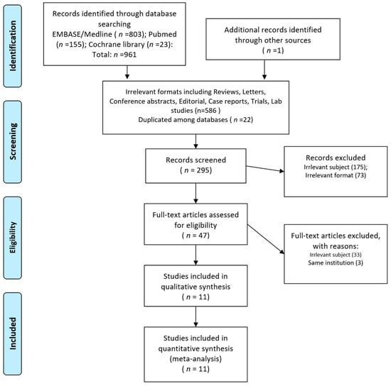 Among the 961 initially identified studies, we excluded 586 studies owing to irrelevant formats and 22 studies owing to duplication among databases. The abstract screening was performed on 295 studies, and a full-text review was performed on 47 studies after excluding 248 studies with irrelevant subjects or formats. A full-text review was performed to identify studies that fully met the inclusion criteria, and 11 studies were finally included in the present study [,,,,,,,,,,]. The selection process is illustrated in Figure 1.