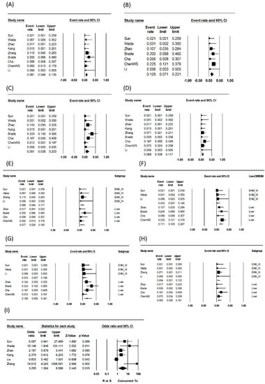 Forest plots of pooled analyses of all included studies regarding (A) gastrointestinal, (B) hepatologic, (C) hematologic, (D) dermatologic grade ≥3 toxicities; subgroup analyses comparing studies with RT targets of intrahepatic and non-intrahepatic lesions, regarding (E) gastrointestinal, (F) hepatologic, (G) hematologic, (H) dermatologic grade ≥3 toxicities. (I) Overall survival comparing concurrent and non-concurrent arms.