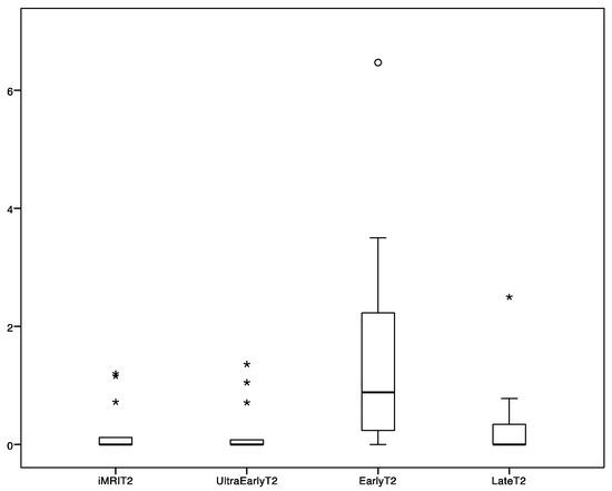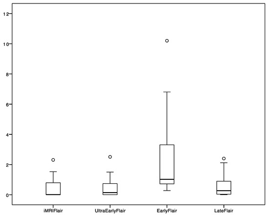 Furthermore, we have added the subgroup analysis of patients with MGMT positive gliomas and found similar results: FLAIR/T2 volume showed a significant difference between iMRI and early MRI (FLAIR p = 0.009 and T2 p = 0.015), between ultra-early and early MRI (FLAIR p = 0.013 and T2 p = 0.005) and between early and late MRI (FLAIR p = 0.007 and T2 p = 0.011). We found no significant differences between iMRI and ultra-early MRI, ultra-early and late MRI and between iMRI and late MRI FLAIR/T2 volumes.