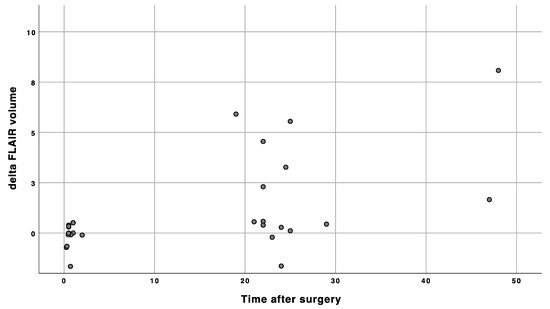 The treatment and postoperative management of patients with LGG is challenging due to its infiltrative growth, which results in inevitable recurrence [10,11]. Additional intraoperative imaging techniques were confirmed as important tools in increasing the extent of resection (EoR) and the number of gross total resections (GTR) in LGG. Both techniques are highly beneficial in increasing PFS and OS [12,13,14,15]. However, the evaluation of early postoperative FLAIR/T2 (<48 h) signal alterations, and the identification of real tumor remnants on early postoperative images can be misleading as a result of surgically induced changes. FLAIR seems to especially overestimate tumor borders on these images [7]. Delineation of tumor remnants in LGG are based on FLAIR and T2 sequences, which play an important role in patient follow-up and in further therapy management of LGG. The timing of adjuvant treatment and its potential impact on further survival has been the subject of many discussions [1,16,17]. Based on an RTOG 9802 study, patients with tumor remnants are assigned for further adjuvant treatment by many neuro-oncologists. Additionally to the side effects of a likely unnecessary treatment, a potential negative influence of early alkylating treatment in LGG has been reported [6,18,19,20].