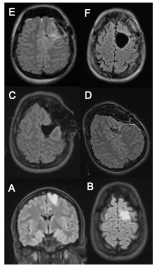 (A,B) hyperintense tumor mass without contrast enhancement on coronar and axial FLAIR. (C) intraoperative and (D) ultra-early postoperative axial MRI FLAIR images. (E) early postoperative axial FLAIR MRI and (F) late axial follow-up FLAIR MRI 3 months after surgery.