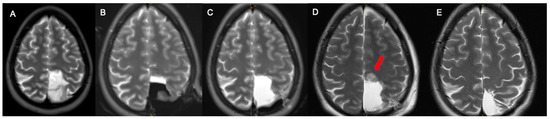 A 36-year-old female patient experienced an episode of temporary visual disturbance. An MRI scan detected a left frontal mass lesion without gadolinium enhancement and with hyperintense signal abnormality in FLAIR sequences (Figure 4A,B). Due to high suspicion of low-grade glioma, iMRI-assisted surgery was performed. iMRI and ultra-early MRI after skin suture confirmed gross total resection (Figure 4C,D). An early postoperative MRI (Figure 4E) showed an increased hyperintense signal of resection cavity borders compared to iMRI and ultra-early MRI. The histopathological and molecular analysis confirmed the oligoadendroglioma WHO°II. No permanent neurological deficit was documented in follow-up 3 months after the surgery. In late postoperative MRI, FLAIR showed GTR similarly to iMRI and ultra-early MRI (Figure 4F). No surgically induced changes are visible in the late postoperative MRI. Additionally, Figure 5A–E depicts an example of another case after resection of diffuse astrocytoma. GTR was confirmed by iMRI (Figure 5B) and ultra-early MRI (Figure 5C). Early T2 showed surgically induced artefacts resembling residual tumor (Figure 5D). Late MRI confirmed GTR (Figure 5E).