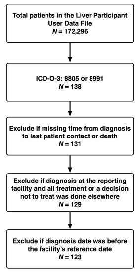 - Shi, Y.; Rojas, Y.; Zhang, W.; Beierle, E.A.; Doski, J.J.; Goldfarb, M.; Goldin, A.B.; Gow, K.W.; Langer, M.; Meyers, R.L.; et al. Characteristics and outcomes in children with undifferentiated embryonal sarcoma of the liver: A report from the National Cancer Database. Pediatr. Blood Cancer 2017, 64, 1–8. [Google Scholar] [CrossRef]