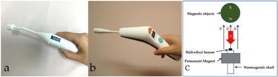 The magnetic probe TAKUMI (Matrix cell Research Institute Inc., Tokyo, Japan): (a) First type: Gen.1; (b) Second type: Gen.2; (c) The detection mechanism of TAKUMI. ① The objects are magnetized by the magnetic fields from the permanent magnet. ② The newly generated magnetic field from the magnetized objects is detected by the Hall effect sensor.