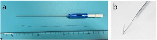 The Guiding-Marker System® (Hakko, Nagano, JAPAN). (a) It consists of a stainless-steel hook connected to a nylon thread and a 21-gauge 10 cm long steel needle. (b) The tip of the marker is bent, and the size of the marker is φ 0.28 mm × 10 mm.