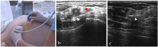 (a–c) The procedure of the Guiding-Marker System® insertion: (a) A needle was inserted using the ultrasound guidance; (b,c) A needle and a guiding marker have clear visibility under the ultrasound. The white arrowheads in b and c indicate guiding markers. The red arrowhead in b indicates a puncture needle.