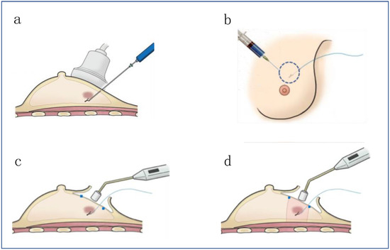 The introduction of mammographic screening programs has led to the identification of an increased number of nonpalpable breast lesions. Currently, in developed countries, approximately 20% to 30% of detected breast cancer cases are nonpalpable [1,2]. Moreover, due to the development of neoadjuvant chemotherapy, there has been an increase in the number of patients in whom a complete response was obtained [3]. These lesions are often difficult to identify preoperatively and intraoperatively. Several techniques have been developed for the localization of nonpalpable breast cancers [1,4,5,6,7]. The two most established techniques for pre-operative localization of nonpalpable breast lesions are wire-guided localization (WGL) and radioactive seed localization (RSL). WGL involves the percutaneous implantation of a hooked wire under image guidance to mark the center or outer edges of target lesions. Although WGL is the most commonly used method [8], it has several disadvantages, including mechanical stimulation of wire plucking, kinking, and patient discomfort. On the other hand, RSL involves implanting a small radioactive seed to identify the lesion and/or its borders. RSL overcomes many of the disadvantages of WGL, but it requires a strict nuclear regimen, which is its main limitation for applicability at hospitals.