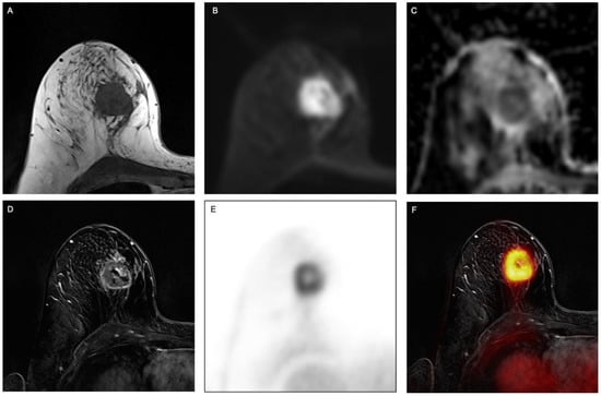 Example of a 63-year-old woman with invasive breast cancer in the right breast, clearly visible on (A) fat-saturated T2-weighted turbo spin-echo (TSE) sequence, (B) transversal diffusion-weighted echo-planar imaging (EPI) sequence with (C) apparent diffusion coefficient (ADC) as well as on (D) contrast-enhanced T1w images, (E) PET and (F) fused PET/MR images.