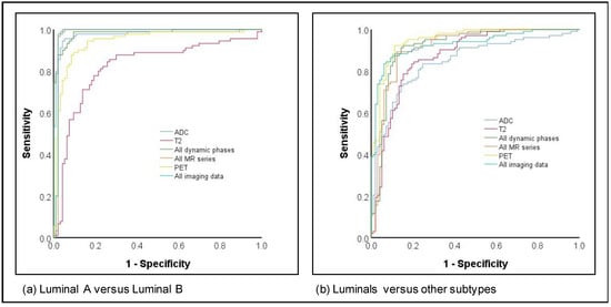 ROC curves for subtype prediction for (a) Luminal A versus Luminal B and (b) Luminals versus other subtypes.