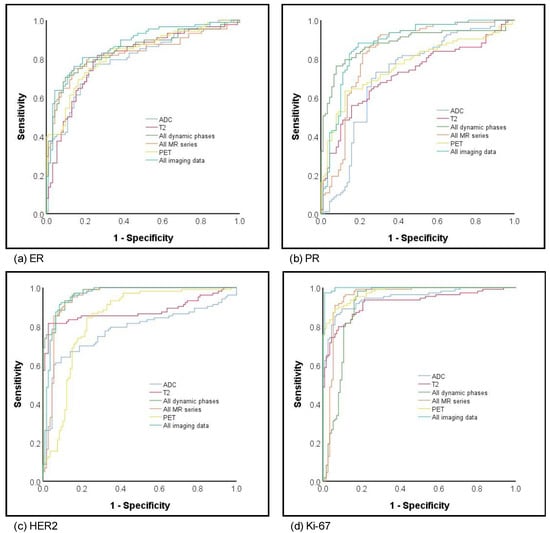 The best results in terms of AUCs for prediction of ER status were achieved by a combination of all MR sequences and PET (0.87) followed by dynamic imaging only (all DCE) without PET, T2 or ADC, comprising an AUC of 0.84 and highest NPV of 88.1. Comparably, the highest AUC for prediction of PR status was also achieved based on all MR sequences combined with PET (AUC 0.88), followed by all dynamics (AUC 0.84). The highest AUCs > 0.90 and corresponding accuracies for prediction of HER2 status were achieved by all DCE (AUC 0.97; accuracy 89%) with comparable values achieved by all MR with (AUC 0.96; accuracy 89%) and without PET (AUC 0.95; accuracy 88.5%). Overall, the highest AUCs of all assessed parameters were achieved for prediction of Ki-67 with eight out of 10 imaging datasets yielding AUCs of ≥ 0.90 and the best results for all MR and PET with an AUC of 1.00 and 95.9% accuracy. Please see Figure 3 for corresponding AUC curves.