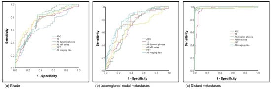 ROC curves for (a) grading and (b) local as well as (c) distant metastatic disease prediction.