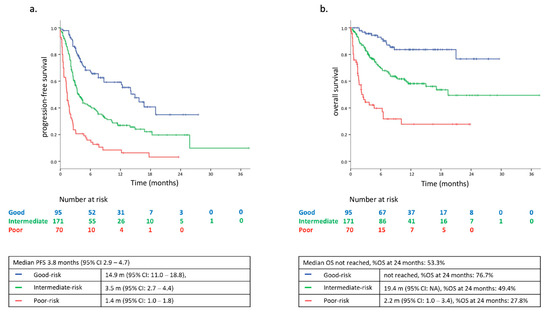 We then evaluated the survival outcomes according to the three risk categories of our prognostic score model. Patients in the good-risk group had a median PFS of 14.9 months (95% CI: 11.0–18.8), whereas in the intermediate-risk and the poor-risk groups, the median PFS was 3.5 (95% CI: 2.7–4.4) and 1.4 months (95% CI: 1.0–1.8), respectively (Figure 1a). The hazard ratio (HR) for PFS was significantly higher in intermediate- compared to good-risk (HR 2.13; 95% CI: 1.50–3.04) and in poor-risk compared to good-risk group (HR 5.46; 95% CI: 3.67–8.10).