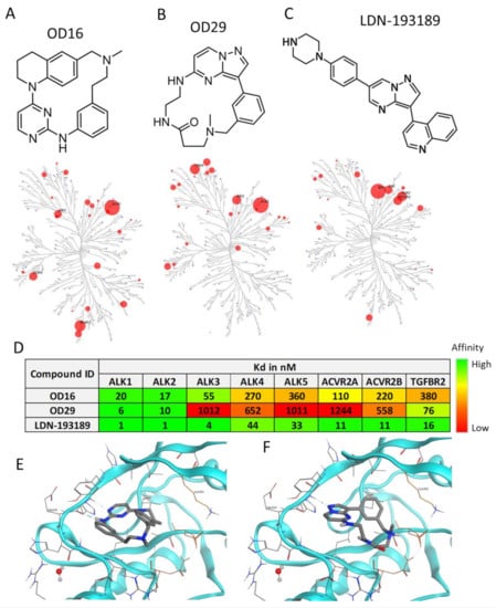 Structure and kinase profile of OD16 and OD29. (A–C) Chemical structure and the activity of a panel of 96 kinases in the presence of 100 nM of OD16 (A), OD29 (B), and LDN-193189 (C). (D) Affinity (Kd) of OD16, OD29, and LDN-193189 for the BMP, activin, and TGF-β type I and type II kinase receptors. (E,F) Structural model of OD16 (E) and OD29 (F) binding to the ALK1 hinge region in the ATP pocket.