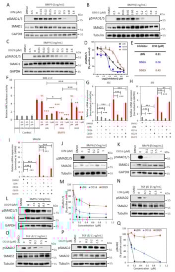 OD16 and OD29 inhibit BMP, but not TGF-β signaling in EA.hy926 cells. (A–C) Western blot analysis of the dose-dependent effects of LDN-193189 (A), OD16 (B), and OD29 (C) on BMP9 (1 ng/mL)-induced SMAD1/5 phosphorylation in EA.hy926 cells. (D) Quantification of the BMP9-induced pSMAD1/5 phosphorylation. GAPDH or Tubulin was used for protein loading controls. Results from three biologically independent experiments were integrated. The results are expressed as mean ± SD. (E) IC50 values of LDN-193189, OD16, and OD29 on BMP9-induced pSMAD1/5 response in EA.hy926 cells. (F) Inhibitory effects of LDN-193189, OD16, and OD29 on BMP9-induced BRE transcriptional reporter activity in EA.hy926 cells. Cells were preincubated with the inhibitors at three different concentrations (0.1 µM, 0.5 µM, and 1 µM) for 1 h and then stimulated with BMP9 at 1 ng/mL for 16 h with the presence of the compounds. Representative results from three biologically independent experiments are shown as mean ± SD. * p < 0.05, ** p < 0.005, *** p < 0.001. NS, non-significant. (G–I) RT-qPCR analysis of the effects of LDN-193189, OD16, OD29 (0.5 µM) or vehicle control (DMSO) on BMP9 (1 ng/mL)-induced ID1 (G), ID3 (H), and SMAD6 (I) mRNA expression in EA.hy926 cells. Expression levels were normalized to those of the housekeeping gene GAPDH. Results from three biologically independent experiments are shown as mean ± SD. ** p < 0.005, *** p < 0.001. (J–L) Western blot analysis of the dose-dependent effects of LDN-193189 (J), OD16 (K), OD29 (L), or vehicle control (DMSO) on BMP6 (50 ng/mL)-induced SMAD1/5 phosphorylation in EA.hy926 cells. (M) Quantification of the BMP6-induced SMAD1/5 phosphorylation. GAPDH or Tubulin was used as loading controls. (N–P) Western blot analysis of the dose-dependent effects of LDN-193189 (N), OD16 (O), OD29 (p), or vehicle control (DMSO) on TGF-β2 (1 ng/mL)-induced SMAD2 phosphorylation in EA.hy926 cells. (Q) Quantification of the TGF-β2-induced SMAD2 phosphorylation. Tubulin was used as a loading control. The results from three biologically independent Western blot experiments were integrated. The results are expressed as mean ± SD. Complete Western Blot images of subfigures (A–C) and (J–L,N–P) are available in Figure S9.