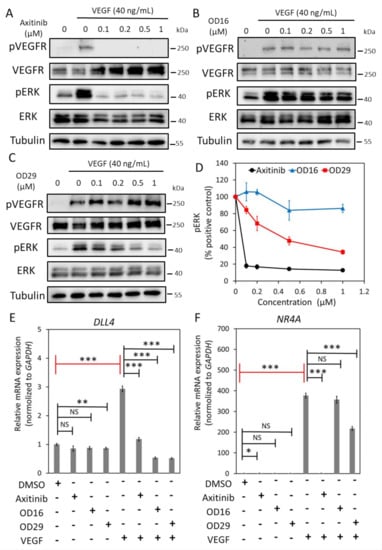 OD29 antagonizes VEGF-induced pERK MAP kinase in HUVECs. (A–C) Western blot analysis of dose-dependent effects of small molecule VEGFR kinase inhibitor Axitinib (A), OD16 (B), OD29 (C), or vehicle control (DMSO) on VEGF (40 ng/mL)-induced VEGFR and ERK MAP kinase phosphorylation in HUVECs. (D) Quantification of the Western blot analysis of VEGF-induced p-ERK MAP kinase. Tubulin was used as a loading control. The results from three biologically independent Western blot experiments were integrated. The results are expressed as mean ± SD. (E,F) RT-qPCR analysis of the effects of Axitinib, OD16, OD29 (0.5 µM), or vehicle control (DMSO) on VEGF (40 ng/mL)-induced DLL4 (E) and NR4 A (F) mRNA expression in HUVECs. Results from three biologically independent experiments are shown as mean ± SD. * p < 0.05, ** p < 0.005, *** p < 0.001. NS, not significant. Complete Western Blot images of subfigures (A–C) are available in Figure S10.