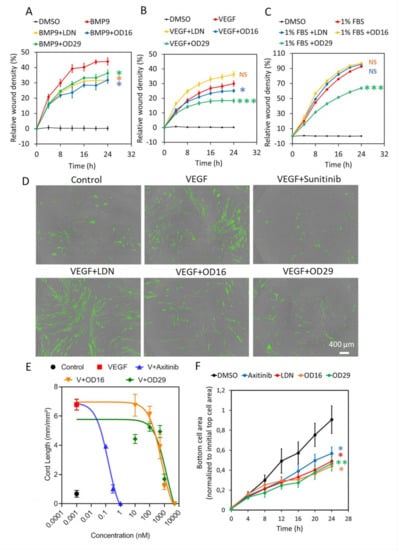 BMP and VEGF pathways are well-known regulators of endothelial cell behavior and small molecules specifically regulating these pathways have a potential value in therapeutic settings [21,56]. A wealth of evidence indicates that VEGF effectively promotes cell proliferation, migration, and tube formation in different endothelial cell types [57,58]. However, the effects of BMP9 on ECs’ growth and migration appear highly context-dependent and require further investigation [14,15]. Both the selective BMPRI inhibitor OD16 and our new dual BMP and VEGF signaling inhibitor OD29 strongly inhibited ECs’ migration induced by VEGF/BMP9 and also inhibited VEGF mediated cord formation and invasion in HUVECs (Figure 4). Our results suggest the potential of OD16 and OD29 as anti-angiogenesis agents.