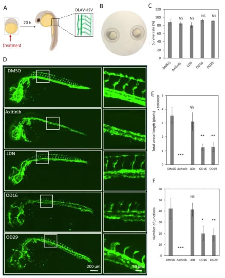 OD16 and OD29 partially inhibit DLAV and ISV formation in zebrafish embryos. (A) Schematic representation of the experimental procedure. The compounds were administered to the 2.5 hpf Tg (fli:EGFP) zebrafish eggs, and DLAV and ISV vascularization was analyzed after 20 h treatment. (B) Representative image of the selected zebrafish embryos that were at the same development stage (around 2.5 hpf). (C) Toxicity assessment of the compounds in zebrafish embryos. The zebrafish survival rate was quantified after the addition of vehicle control (DMSO), Axitinib, LDN-193189, OD16, or OD29 (0.5 µM) in egg water for 3 days. Experiments were performed three times, and representative results are shown. NS, not significant. (D) Effects of OD16, OD29, Axitinib, and LDN-193189 at 0.5 µM, or vehicle control (DMSO) on zebrafish DLAV and ISV development. Compounds were added to the egg water for 20 h. Representative images of overview (left panel) and high magnification (white rectangle areas from left) are shown. Scale bars represent 200 and 50 µm (left and right panel, respectively). (E,F) Quantification of the DLAV and ISV formation of each treatment group of experiments shown in (D); the results are represented as total vessel length (E) and the number of junctions (F), and are expressed as mean ± SD. * p < 0.05, ** p < 0.005, *** p < 0.001. NS, not significant.