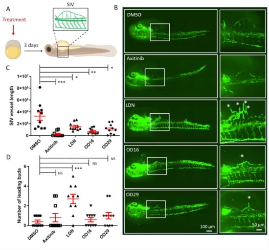 To further investigate the anti-angiogenic potential of OD16 and OD29, we assessed their influence on SIV formation at a relatively late stage of zebrafish embryonic development (Figure 6A). After exposure of the 2.5 hpf embryos to the compounds for 3 days, the SIV formation was examined. In vehicle control-treated zebrafish embryos, intact and well-shaped SIV developed after 3 dpf (Figure 6B upper panel). In the presence of Axitinib, a strong reduction in the number of SIVs and serious other vascular defects were observed, consistent with previous reports [54]. In the LDN-193189 treatment group, the SIV was slightly less well-developed than in the control group. Of note, LDN-193189 induced an abnormal phenotype of the vessels, as numerous ectopic SIV tip cells were observed (Figure 6B labeled with stars). In contrast, a significant decrease in the number of ectopic vessels and SIV tip cells was observed in OD16 treated embryos. Similarly, the embryos treated with OD29 exhibited an anti-angiogenic SIV phenotype. We quantified the SIV vessel length and the number of tip cells in each group (Figure 6C,D). As shown in Figure 6C, both OD16 and OD29 significantly inhibited vessel formation as compared to vehicle control-treated zebrafish embryos. Axitinib markedly inhibited angiogenesis, and LDN-193189 treatment resulted in a lack of SIV vessels compared with the control group. Interestingly, unlike Axitinib, OD16 and OD29 did not influence the formation of tips. LDN-193189 significantly increased the number of disorganized SIV tip cells, which might drive the subsequent ventral expansion of the SIV (Figure 6D). These results support the idea that OD16 and OD29 inhibit angiogenesis in vivo.